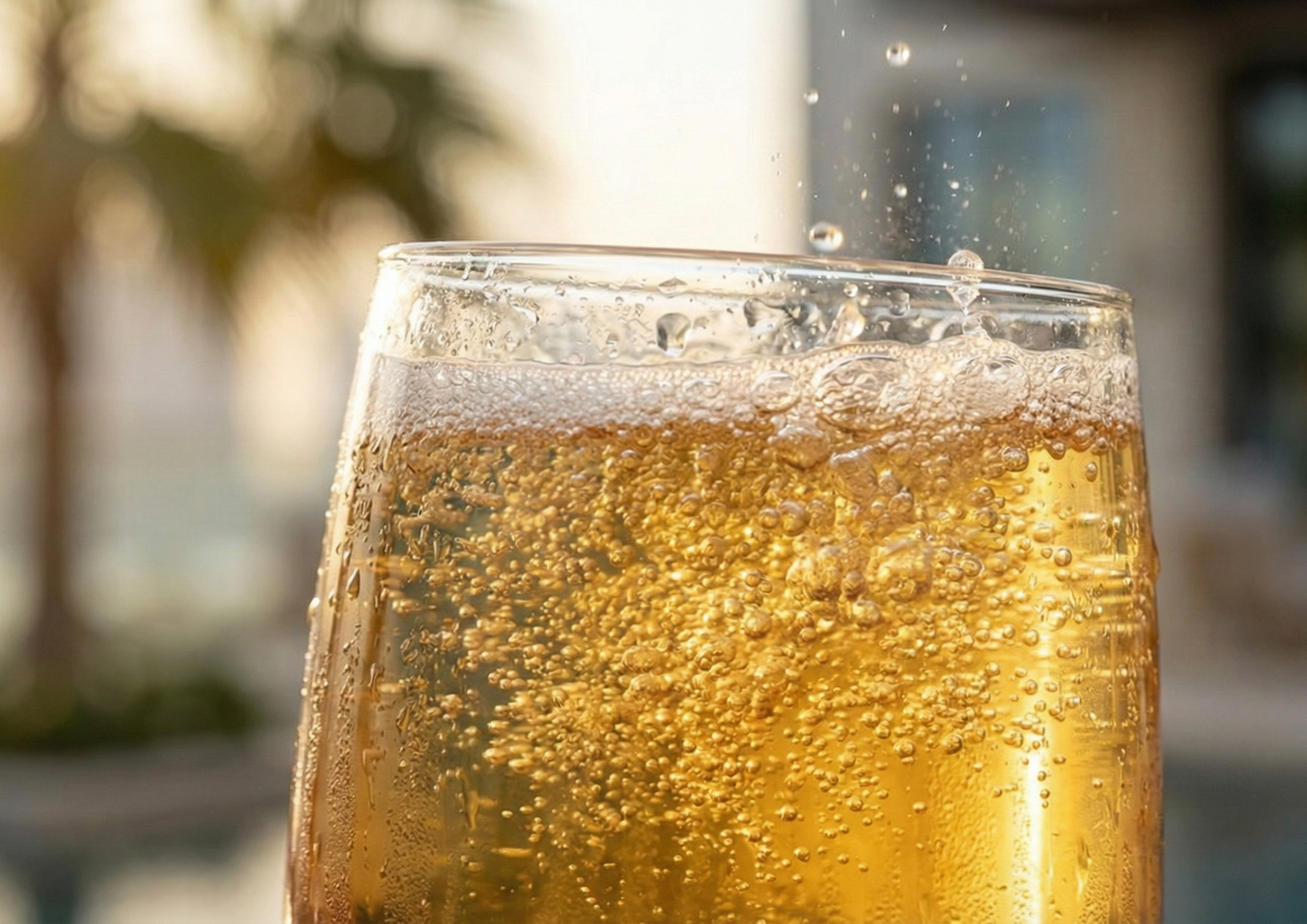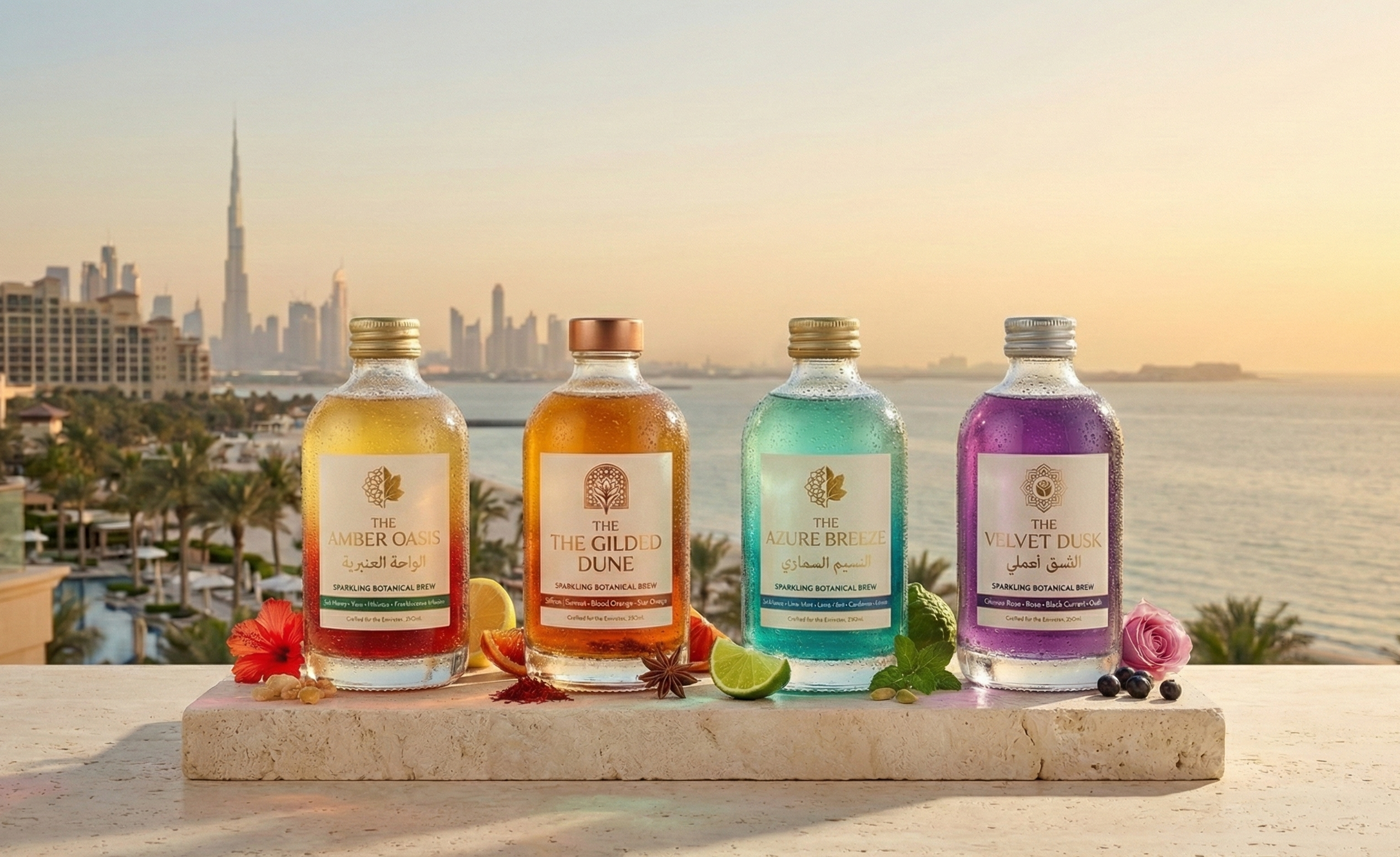 The Amber Oasis offers a refreshing escape, blending functional botanicals with effervescence for a revitalizing experience.